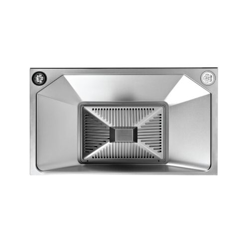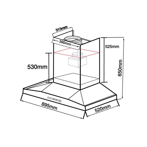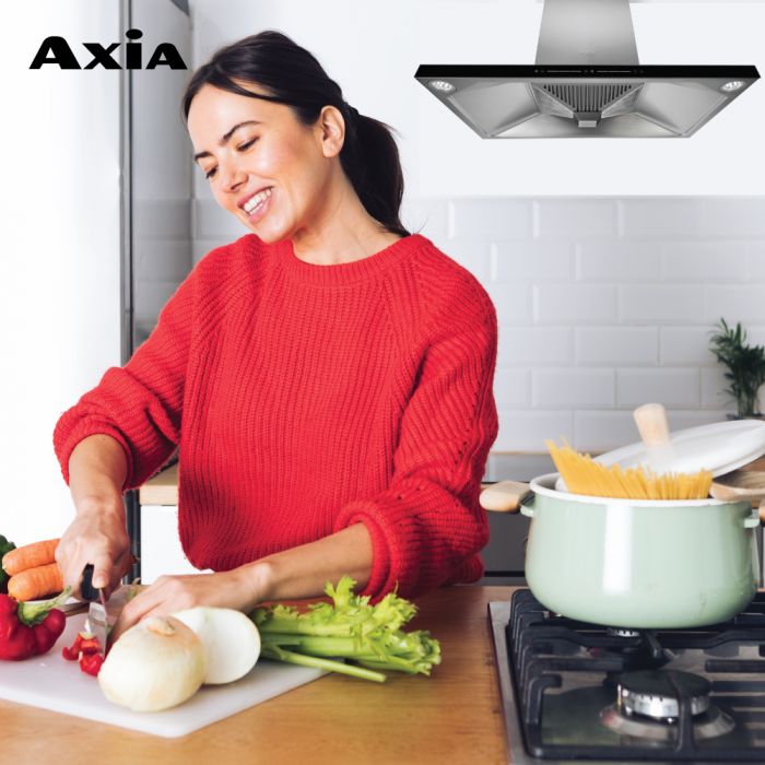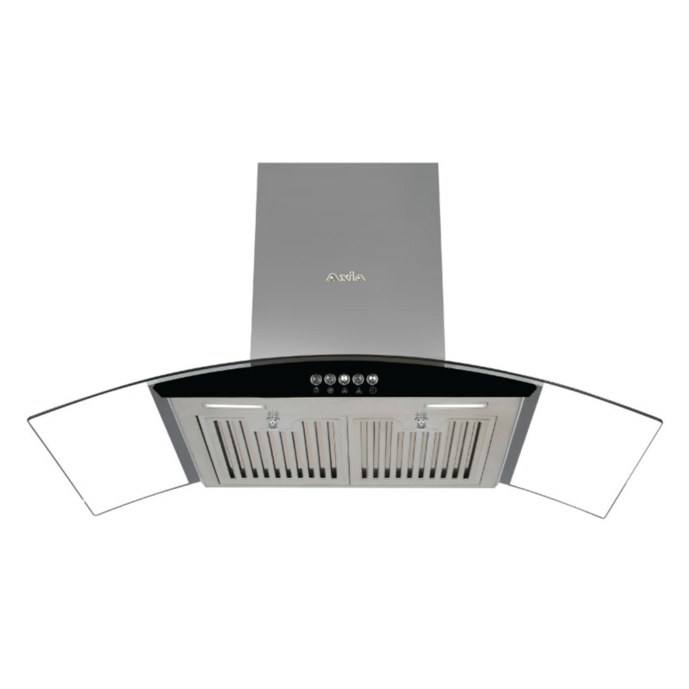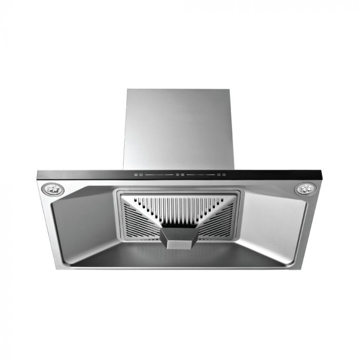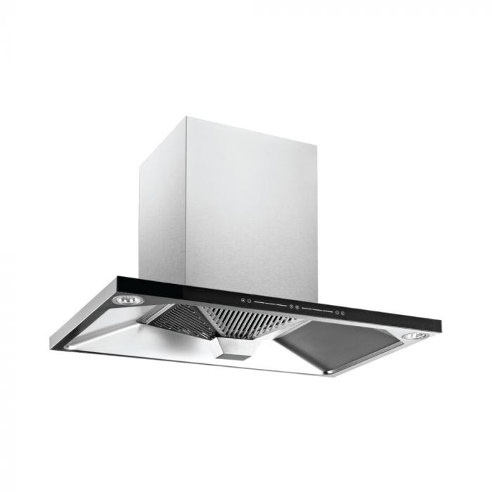 Black glass screen hood has a modern cut on the edges come with baffle filter and special oil tray in titling angle.