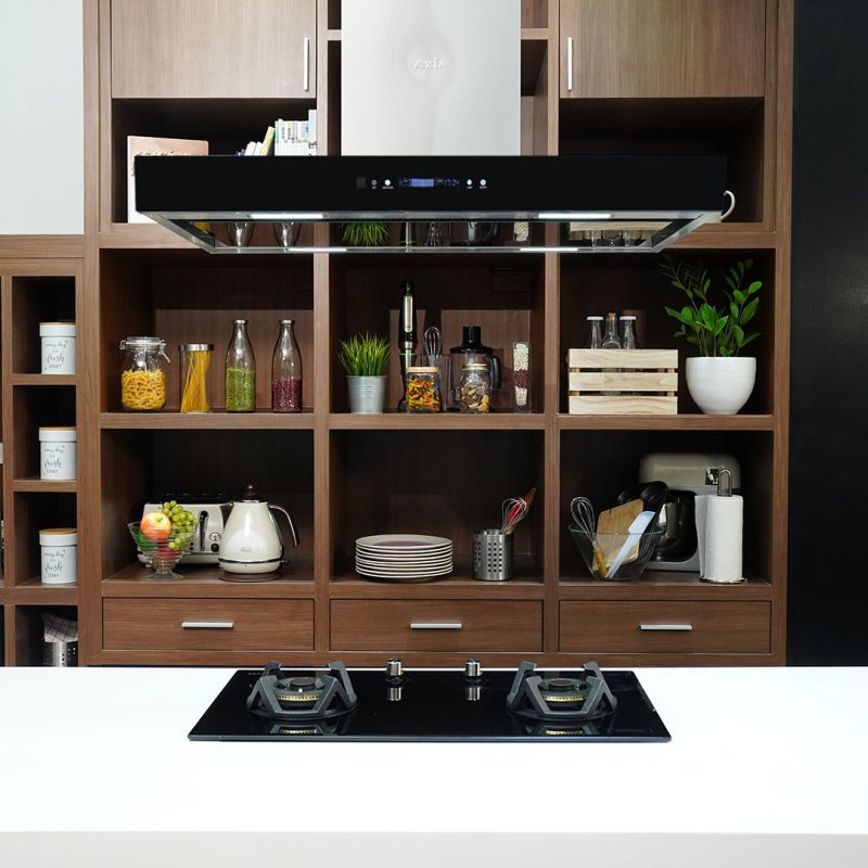 This range hood has a full suction capacity of up to 1,500 cubic meters per hour. The new evolution of the super large motor can eliminate odours, smoke and heat completely installed with a special movement Two-side gesture sensor control. "Just wave your hand lightly" without touching the machine to control the operation.